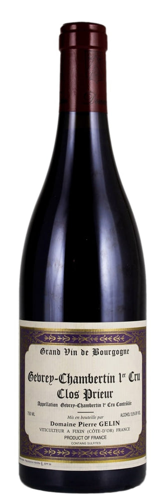 Domaine Pierre Gelin's Clos Prieur 1er cru was planted in 1964 and shows classic Gevrey-Chambertin typicity with black fruit, structure, and assertiveness.